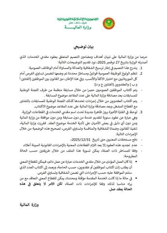 حرصًا من وزارة المالية على تبيان أهداف ومضامين التعميم المتعلق بعقود مقدمي الخدمات الذي أصدرته الوزارة بتاريخ 27 نوفمبر 2025، نود تقديم التوضيحات التالية: