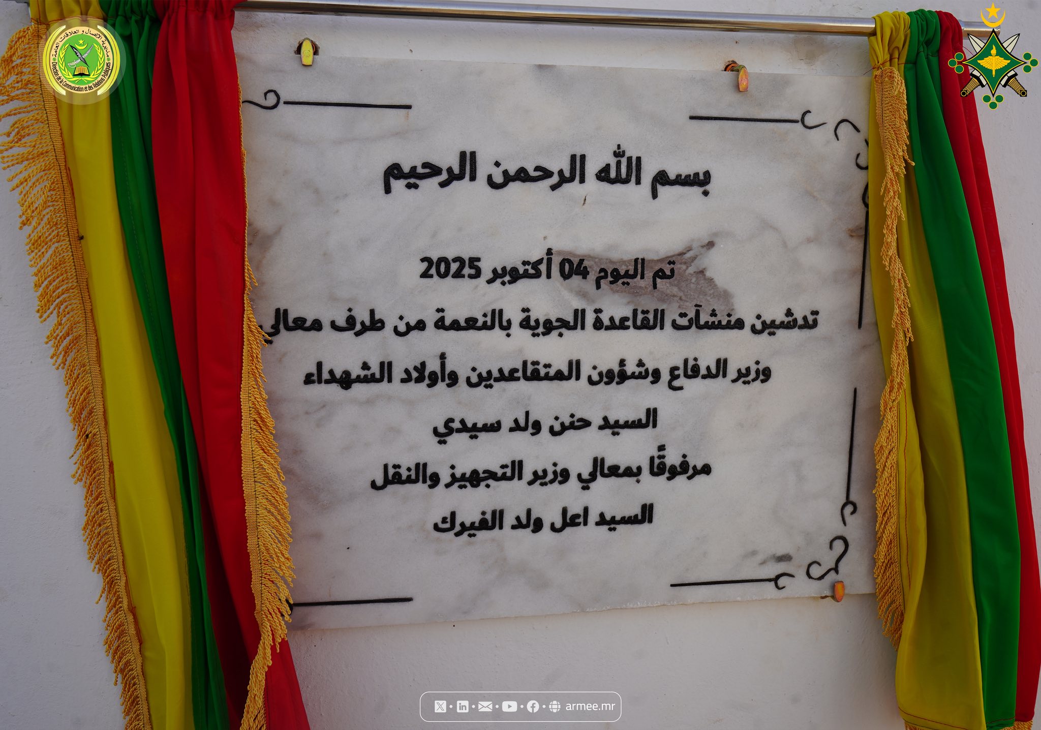 أشرف وزير الدفاع وشؤون المتقاعدين وأولاد الشهداء؛ حنن ولد سيدي، رفقة وزير التجهيز والنقل؛ اعل سيد أحمد الفيرك، وعدد من الجنرالات في الجيش الوطني، صباح السبت 4 اكتوبر 2025، بالقاعدة الجوية في مدينة النعمة عاصمة ولاية الحوض الشرقي، على تدشين موقف للطائرات ومركبات الدعم الفني. وممر يربط المدرج بساحة موقف الطائرات، ومحطات أرضية للتحكم والتشغيل، وعنابر لتأمين الطائرات وتجهيزها وفقا لمعايير السلامة.