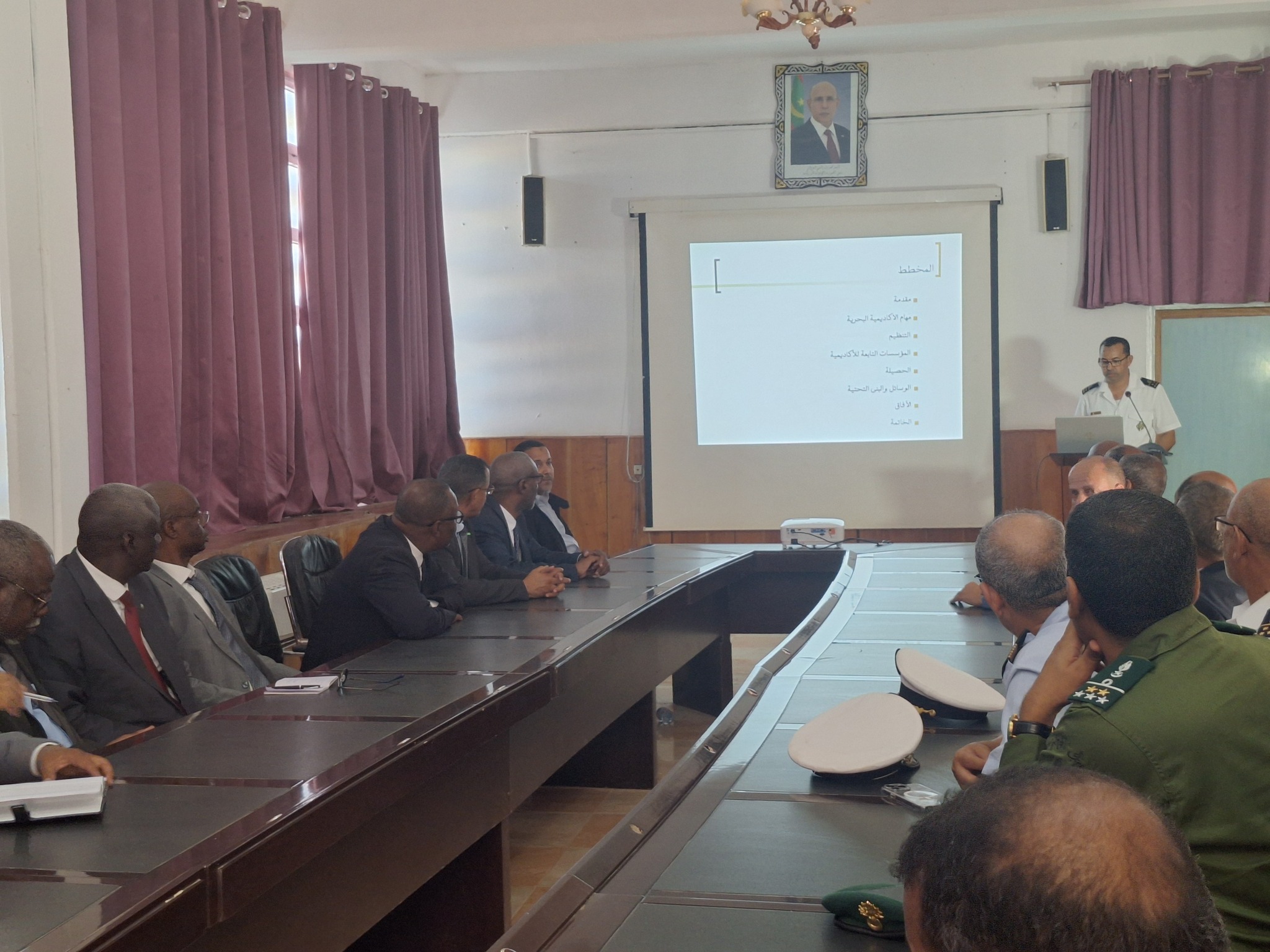 خلال الزيارة، استمع وزير الصيد لعرض مفصل وقيم حول الأكاديمية البحرية ومهامها والدور المميز الذي تقوم به في تكوين وتأهيل ضباط البحرية الوطنية والبحرية التجارية، قدمه العقيد البحرى قائد المدرسة العليا للضباط أحمد سالم ولد مولود.