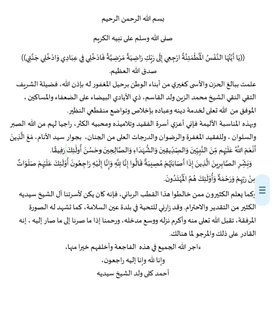 تقدم أحمد كلي ولد الشيخ سيديا بالتعازي في وفاة الولي الصالح محمد الزين ولد القاسم، تغمده الله بواسع رحمته، وألهم الشعب الموريتاني الصبر والسلوان و"إنا لله وإنا إليه راجعون".