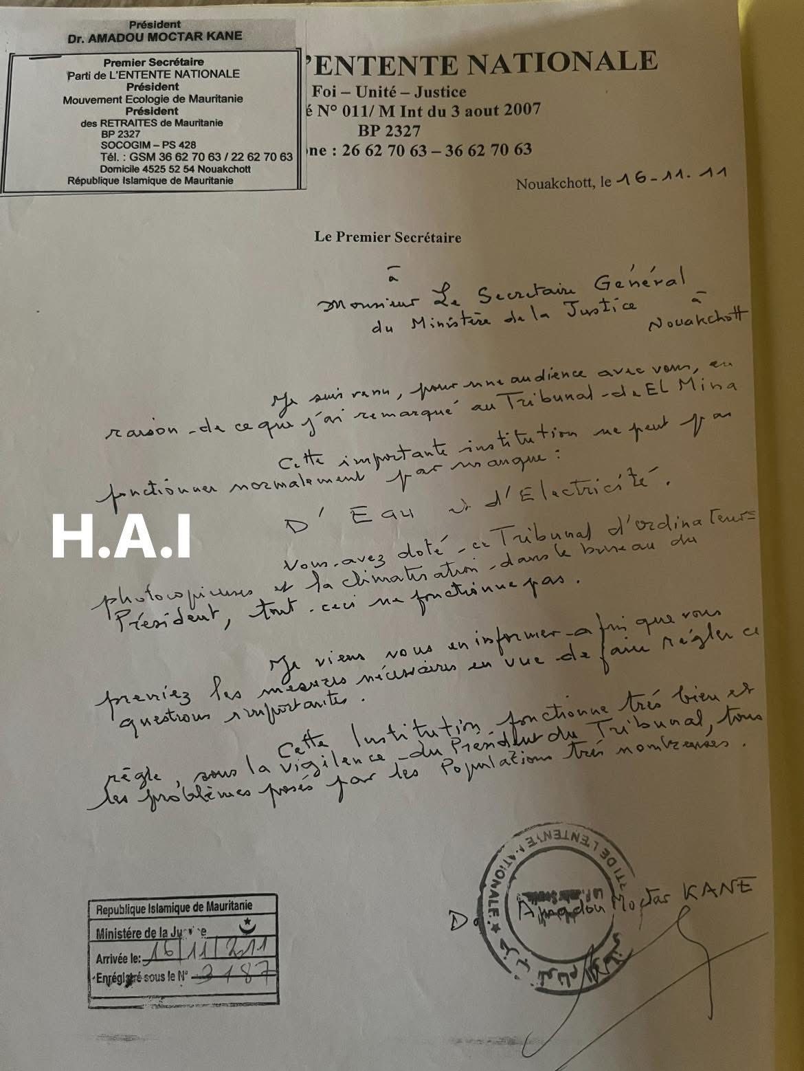 في أحد الأيام زارني في محكمة مقاطعة الميناء الرجل الوطني الدكتور آمدو مختار كــان رئيس حزب الوئام الوطني وهو مرشح سابق لرئاسة الجمهورية وسلمني نسخة من رسالة سلمها لأمانة وزارة معالي وزير العدل آنذاك الدكتور عابدين ولد الخير بشأن ما رأى بأم عينه كمُراجع مما يندى له الجبين فكتبه بصدق وغيرة وطنية شفقة على شاب يتقد حماسا للوطن وخدمة الدولة وهو ما يزال في بداية عمله العدلي.رحمه الله رحمة واسعة.