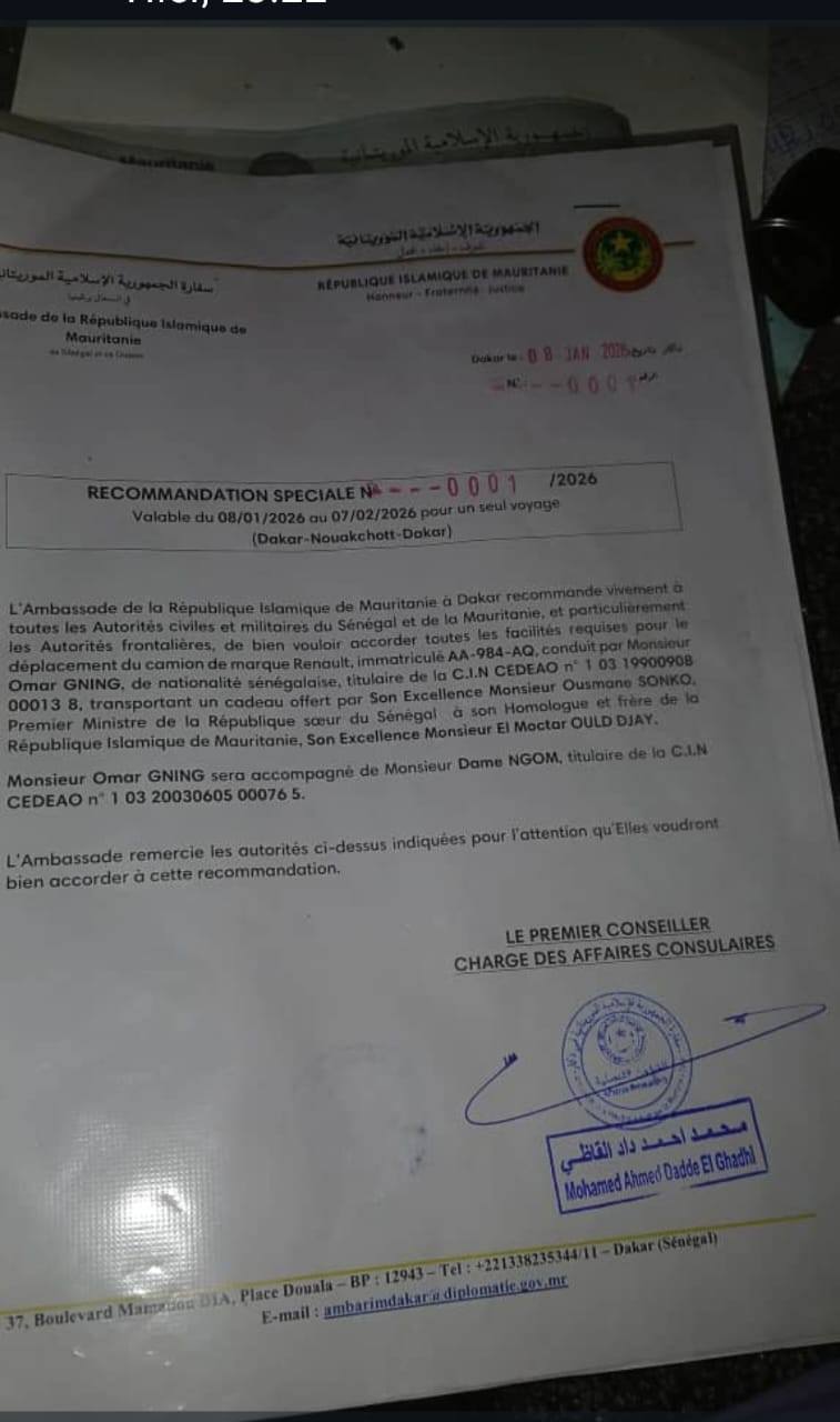 توصي جميع السلطات الأمنية للبلدين بفتح المجال أمام شاحنة محملة بهدية خاصة قدمها الوزير الأول السينغالي السيد عثمان سونكو ،