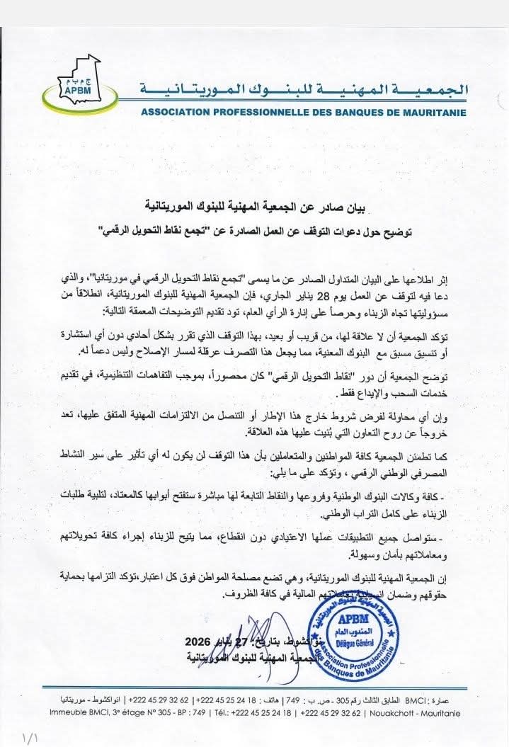 وختمت الجمعية المهنية للبنوك الموريتانية بيانها بالتأكيد على أن مصلحة المواطن تظل فوق كل اعتبار، مجددة التزامها بحماية حقوق الزبناء وضمان استمرارية الخدمات المالية في مختلف الظروف.