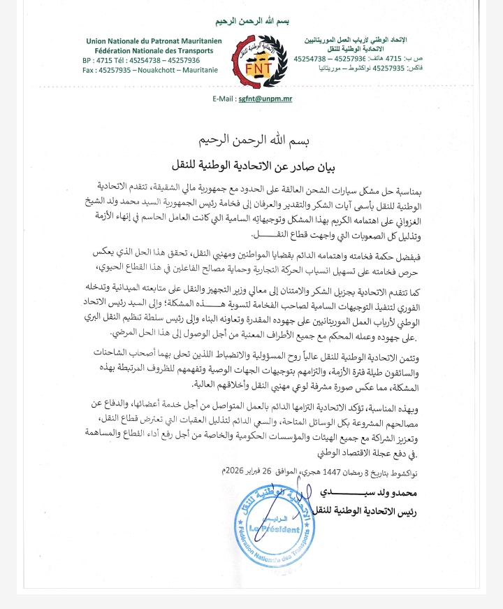 أشادت الاتحادية الوطنية للنقل بالجهود التي بذلتها السلطات العليا في موريتانيا، من أجل حل مشكل الشاحنات العالقة على الحدود مع جمهورية مالي، معربة عن بالغ شكرها وتقديرها للرئيس محمد ولد الغزواني على تدخله الذي وصفته بـ: "الحاسم الذي أسهم في إنهاء الأزمة وتذليل الصعوبات التي واجهت قطاع النقل".