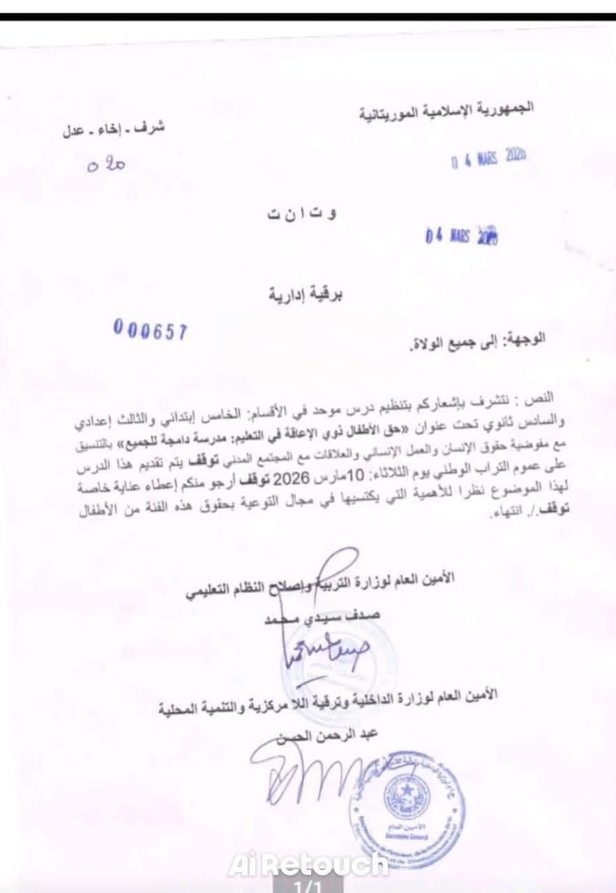 تم توجيه تعميم للولاة من وزارتي الداخلية والتربية، أعلنت خلاله الأخيرة عن تنظيم درس موحد للخوامس الابتدائية والثوالث والسوادس من التعليم الثانوي، وذلك يوم الثلاثاء المقبل تحت عنوان "حق الأطفال ذوي الإعاقة في التعليم".