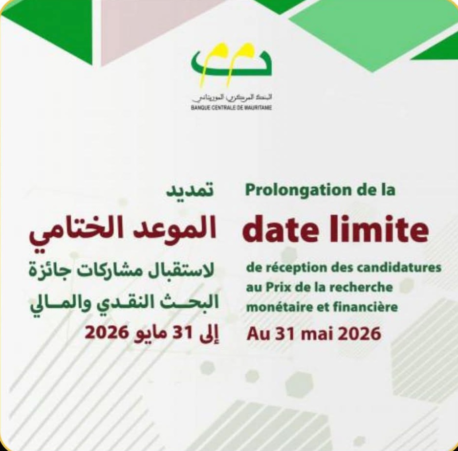أعلن البنك المركزي الموريتاني عن تمديد الموعد النهائي لاستلام ملفات الترشح لجائزة البحث النقدي والمالي إلى غاية 31 مايو 2026.