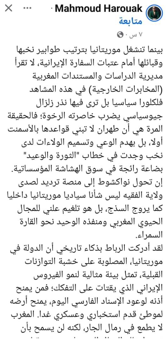 لقد مضى ذلك المدون في كذبه وتلفيقه إلى حد القول بأن موريتانيا منشغلة "بترتيب طوابير نخبها وقبائلها أمام عتبات السفارة الإيرانية"، زاعماً بأن "المخابرات الخارجية المغربية" لا تقرأ في ذلك المشهد "فلكلورا سياسيا" بل ترى فيه "نذر زلزال جيوسياسي يضرب "الخاصرة الرخوة" للمغرب؛ وأن طهران لا تبني قواعدها بالإسمنت أولا، بل بهدم الوعي وتسميم الولاءات!