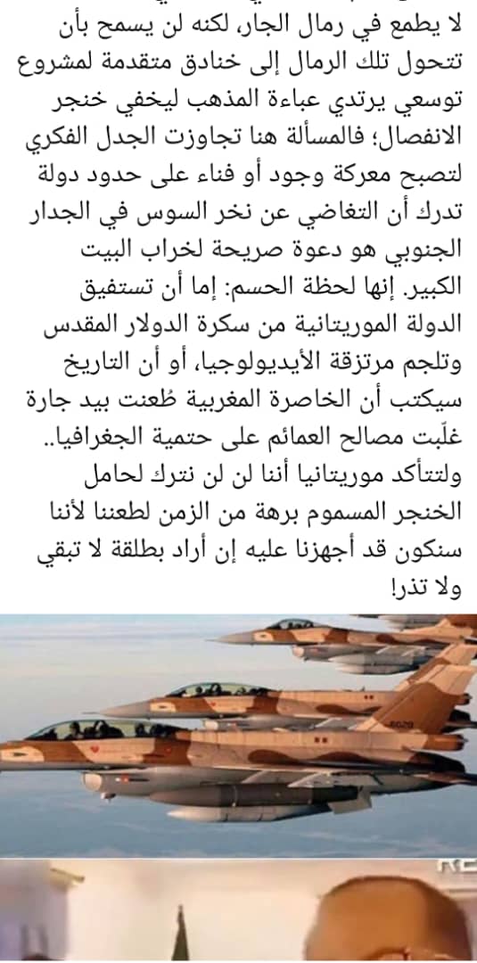 وهنا ينبغي تذكير هذا "المأمور" بأن المحافظة على الممر الوحيد لبلاده نحو أفريقيا (موريتانيا)، كما اعترف بذلك، لن يكون من خلال الإساءة والتحريض والتهديد، بل باحترام السيادة والاستقلال والمصالح المشتركة، بما في ذلك التبادلات التجارية اليومية المتزايدة، والتسهيلات الموريتانية لصالح التجارة المغربية الأفريقية، الأن أي تصرف طائش اتجاه بلادنا ستكون نتيجته المباشرة إغلاق الحدود البرية وإغلاق الأجواء في وجه أكثر من 140 رحلة للخطوط الملكية المغربية تعبر الأجواء الموريتانية أسبوعياً باتجاه دول غرب ووسط أفريقيا، فضلا عن أنه سيمثل نهاية حلم "مشروع أنبوب الغاز المغربي النيجيري".