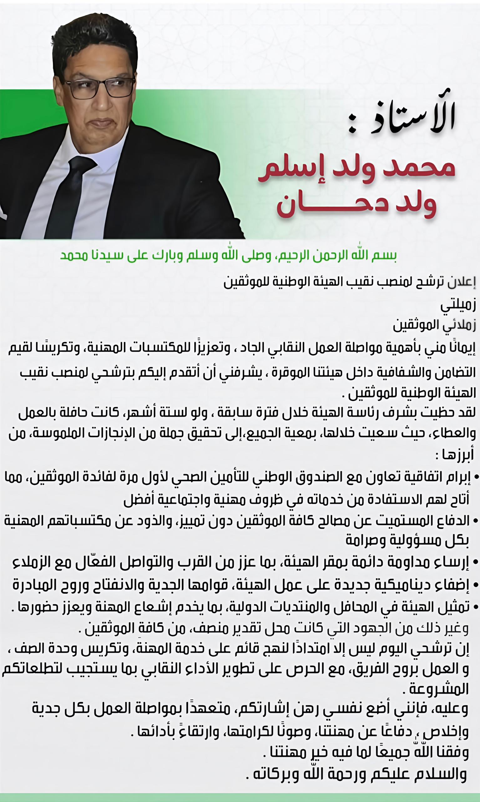 أعلن الأستاذ محمد ولد إسلم ولد دحان ترشحه لمنصب نقيب الهيئة الوطنية للموثقين الموريتانيين في إعلان ترشح، جاء فيه: "