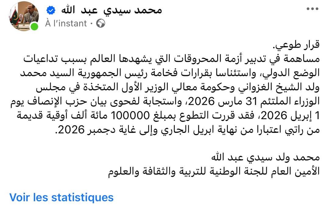 مساهمة في تدبير أزمة المحروقات التي يشهدها العالم بسبب تداعيات الوضع الدولي، واستئناسا بقرارات فخامة رئيس الجمهورية السيد محمد ولد الشيخ الغزواني وحكومة معالي الوزير الأول المتخذة في مجلس الوزراء الملتئم 31 مارس 2026، واستجابة لفحوى بيان حزب الإنصاف يوم 1 إبريل 2026، فقد قررت التطوع بمبلغ 100000 مائة ألف أوقية قديمة من راتبي اعتبارا من نهاية ابريل الجاري وإلى غاية دجمبر 2026.