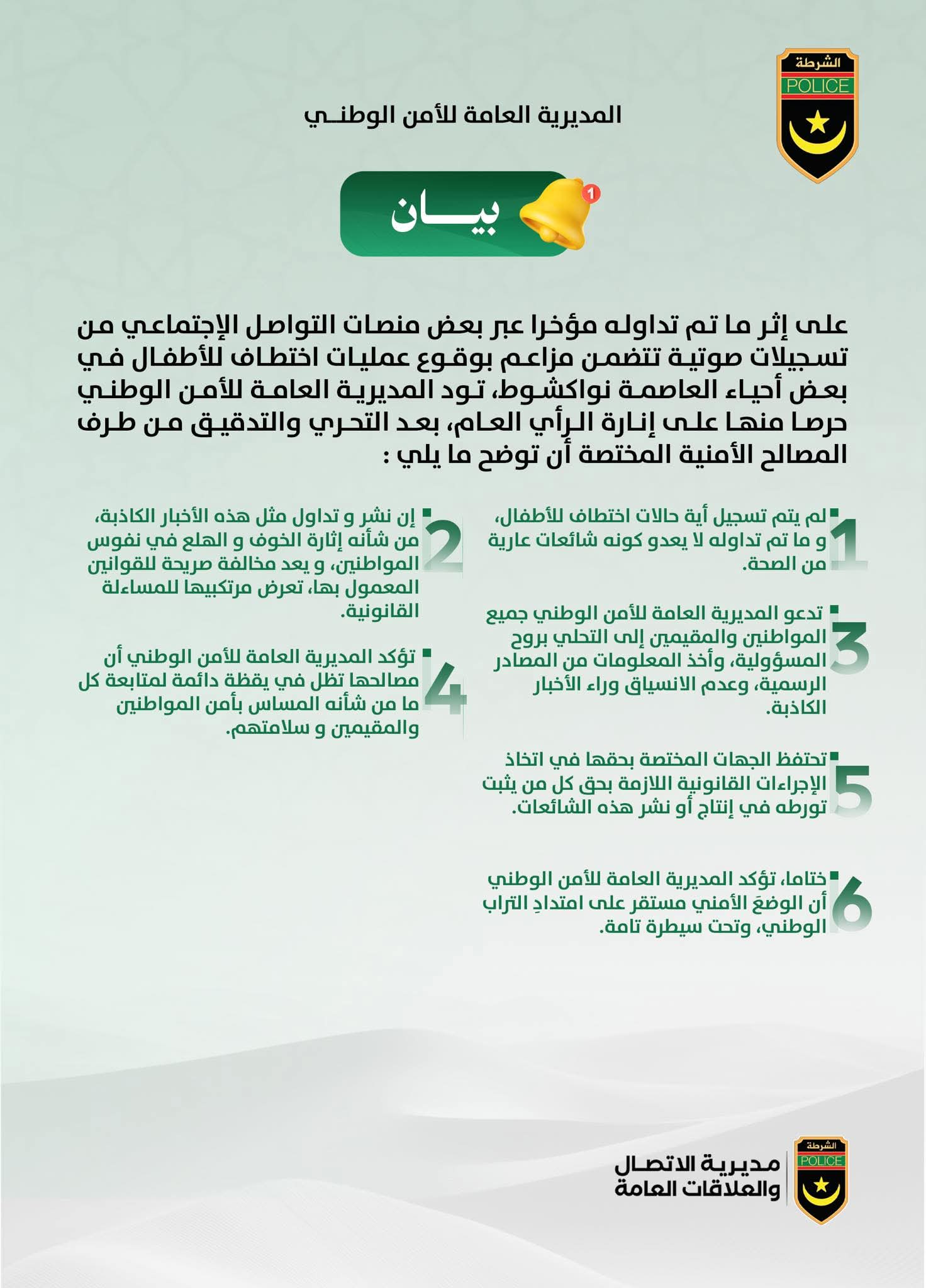 نفت المديرية العامة للأمن الوطني، مساء الثلاثاء، صحة ما تم تداوله على منصات التواصل الاجتماعي بشأن وقوع حالات اختطاف للأطفال في بعض أحياء نواكشوط، مؤكدة أن هذه المزاعم "لا أساس لها من الصحة".